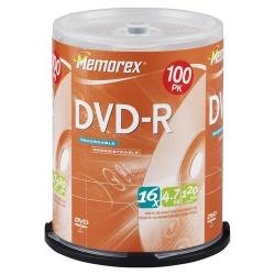 The DVD-R 4.7GB 100 pack is used with DVD Recordable Drives that support DVD-R/RW blank media and certain DVD-RAM Recordable Drives that incorporate DVD-R as a write once solution. Features Manufacturer Memorex Products, Inc Manufacturer Part Number 32025641 Standard Warranty 1 Year(s) Form Factor 120mm Standard Storage Capacity 4.7GB Manufacturer Website Address www.memorex.com Product Name 16x DVD-R Media Packaged Quantity 100 Packing Spindle Product Type DVD-R