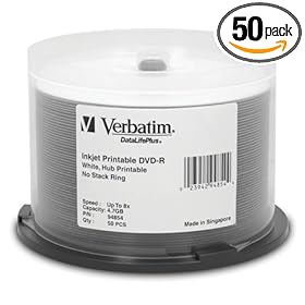 Combining an exceptional inkjet hub-printable surface with professional grade, Metal Azo, recording performance and reliability, Verbatim DataLifePlus White Inkjet Hub Printable DVD-R 8x discs are the ultimate choice for developing, customizing and distributing DVD content. Certified for 1x-8x DVD recording and preferred by DVD-R drive manufacturers, Verbatim DataLifePlus DVD-R media uses an advanced Metal Azo recording dye to provide the highest level of performance, compatibilit (more...)